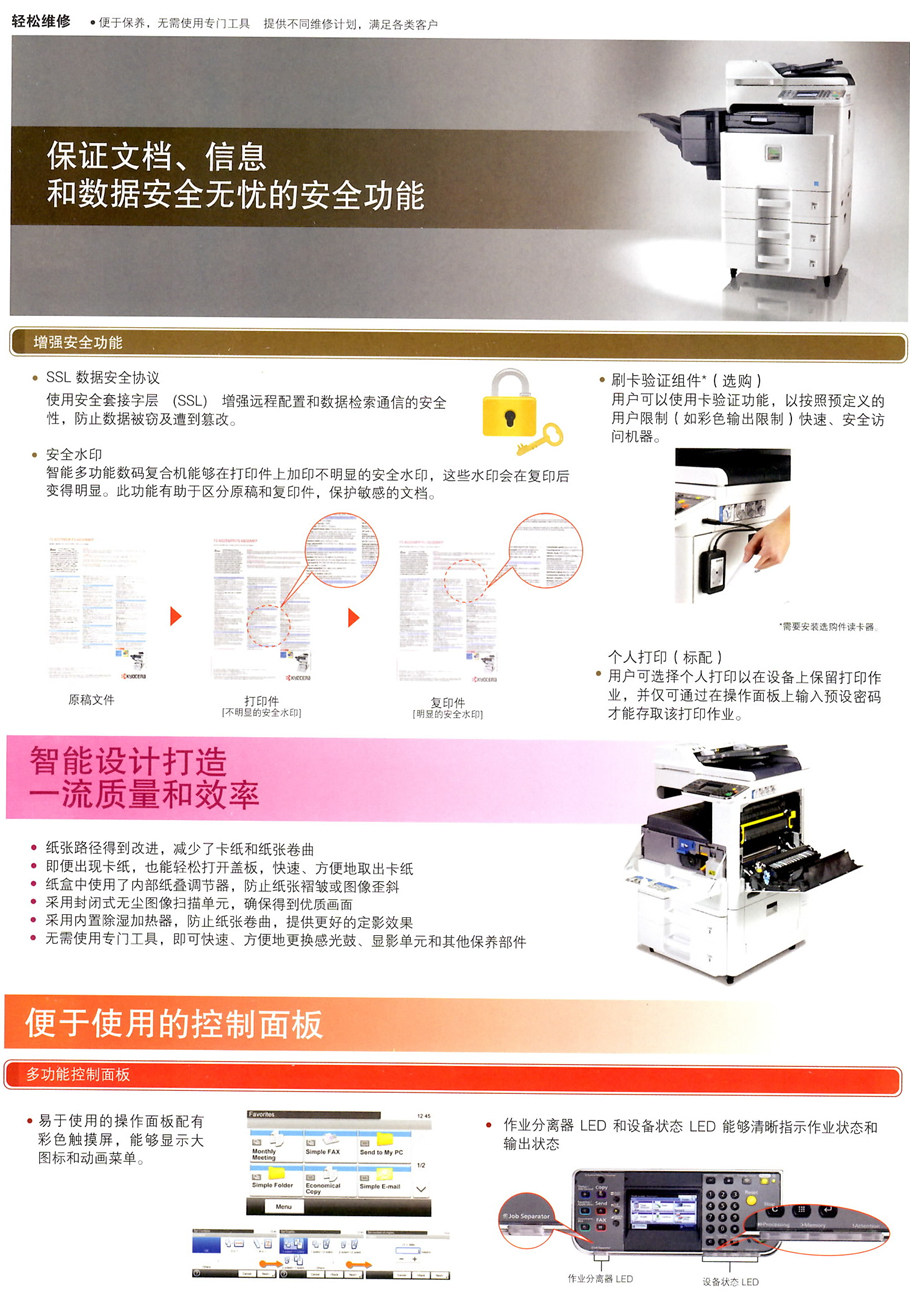 描述:4.3英寸彩色觸摸式面板,便捷的操作性、人性化設(shè)計(jì)的用戶使用界面/卡紙率低,卡紙排除便利/京瓷獨(dú)創(chuàng)的長(zhǎng)壽命、高品質(zhì)非晶硅感光鼓/維修服務(wù)便利/可選購(gòu)傳真組件/25頁(yè)/分鐘,打印速度快
