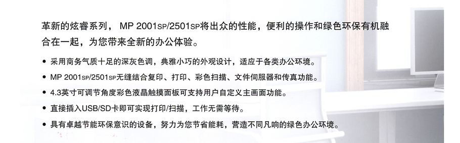 描述:標(biāo)準(zhǔn)配置,不帶自動進稿器 1G超大內(nèi)存,千兆網(wǎng)卡,升級經(jīng)典型號!網(wǎng)絡(luò)打印掃描 雙面打印 可選自動輸稿器和雙紙盒/1、革新的控制引擎 2、全新的外觀設(shè)計 3、4.3英寸彩色觸摸液晶操作面板 4、用戶自定義主界面 5、支持USB/SD卡直接打印掃描 6、支持ID卡復(fù)印功能 7、標(biāo)配千兆網(wǎng)卡。
