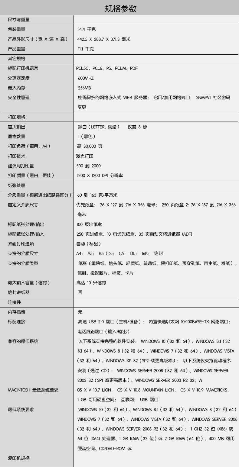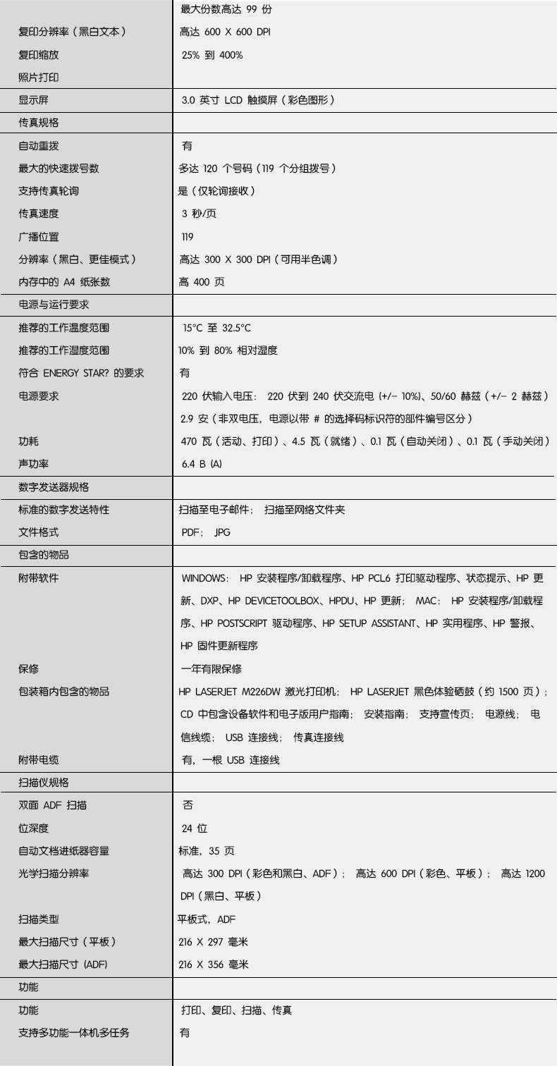 描述:原裝正品行貨、支持自動(dòng)雙面打印(自動(dòng))、黑白激光多功能一體機(jī)LaserJet Pro MFP M226dw