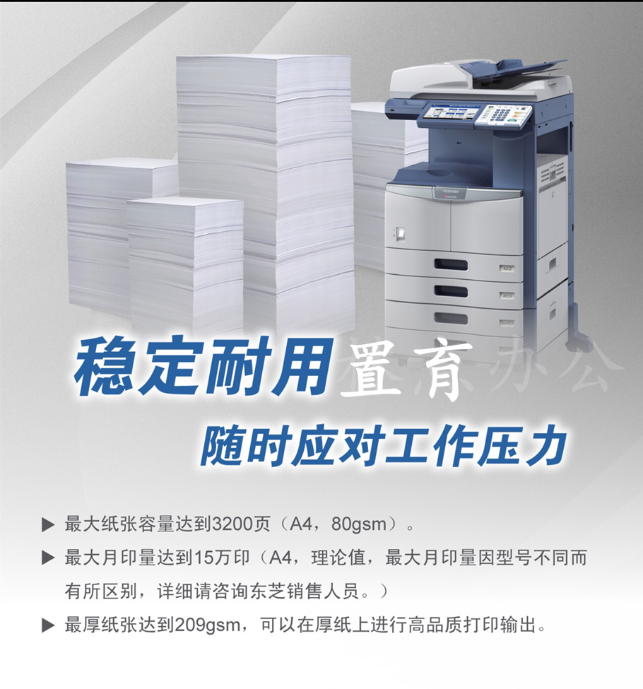 描述:東芝e-SUTDIO357SD的預(yù)熱時間控制在約20秒以內(nèi),首頁復(fù)印時間僅需3.7秒。連續(xù)輸出速度達到每分鐘35頁。標(biāo)配的雙面器更能有效地提高輸出效率和成本,減少紙張使用。采用9.0英寸彩色中文液晶觸摸面板,外觀更精美,操作更便捷。