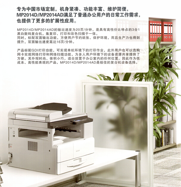 描述:理光炫致系列黑白數(shù)碼復(fù)合機,專為中國市場定制,機身緊湊、功能豐富、維護簡便,MP2014滿足普通辦公用戶的日常工作需求的同時,也提供了更多的擴展性應(yīng)用。集復(fù)印、打印和彩色掃描于一體,是具有高性價比特點的3合1黑白多功能數(shù)碼復(fù)合機。