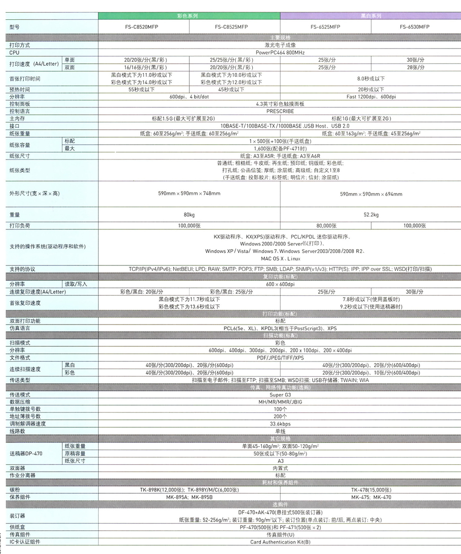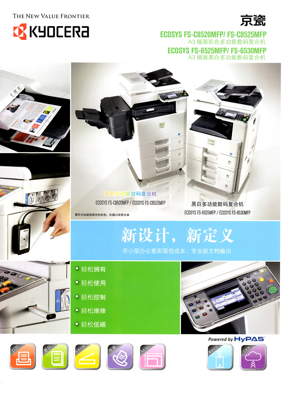 描述:4.3英寸彩色觸摸式面板,便捷的操作性、人性化設(shè)計(jì)的用戶使用界面/卡紙率低,卡紙排除便利/京瓷獨(dú)創(chuàng)的長(zhǎng)壽命、高品質(zhì)非晶硅感光鼓/維修服務(wù)便利/可選購(gòu)傳真組件/25頁(yè)/分鐘,打印速度快
