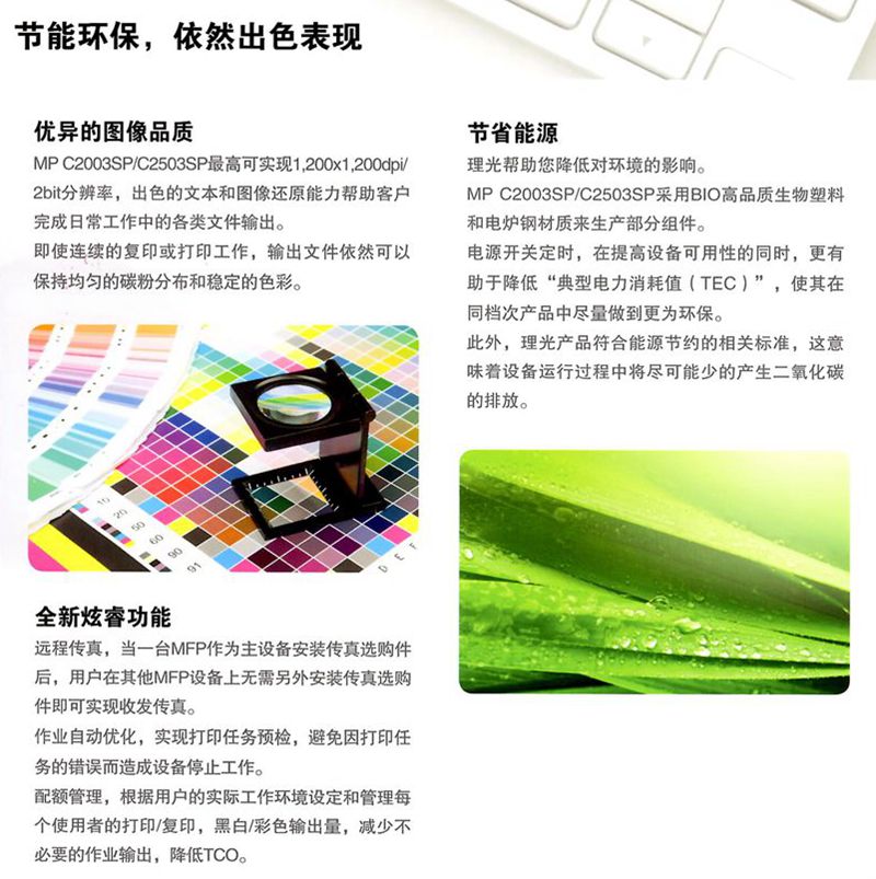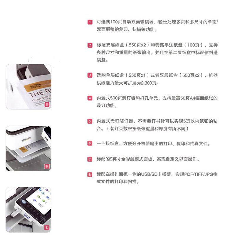描述:2014新款上市機(jī)型,比老款C2551處理速度提高,卡紙率降低,是一款同級(jí)別機(jī)型中佼佼者!9英寸超大彩色觸摸面板超短的預(yù)熱時(shí)間和首頁(yè)復(fù)印時(shí)間打印分辨率提升到最高1,200x1,200dpi/2bit 支持SRA3(320x450mm)尺寸紙張輸出單面紙張重量可達(dá)300g/m2 標(biāo)配信封供紙盤(pán)理光特有的無(wú)釘裝訂選購(gòu)件海報(bào)打印功能。